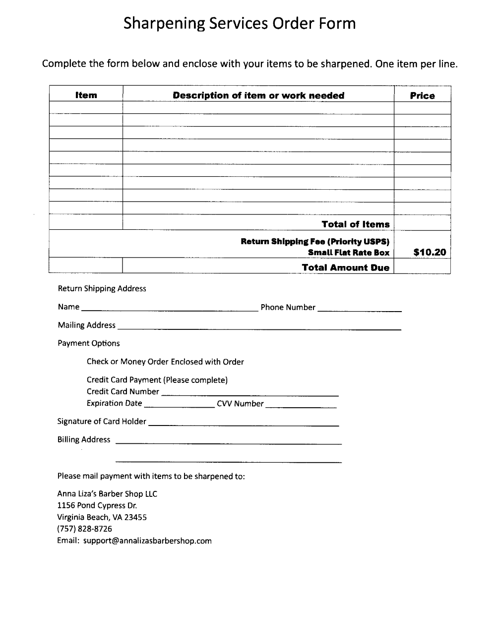 We know how important your cutting tools are and how, when they become dull or nicked, that they no longer perform the way they need to. Here at Anna Liza's Barber Shop we offer local (Hampton Roads, Virginia) and mail-in sharpening services.